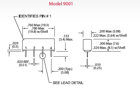 9001-12-00 features: (1)High Insulation Resistance - 1012Ω minimum (1013Ω typical); (2)High reliability, hermetically sealed contacts for long life (tested up to 1 Billion Operations); (3)High dielectric strength available, consult factory; (4)High speed switching compared to electromechanical relays; (5)Molded thermoset body on integral lead frame design; (6)Coaxial Shield for 50Ω impedance and switching of fast rise time digital pulses - 9002 only; (7)Optional Coil Suppression Diode - protects coil drive circuits; (8)UL File #E67117, CSA File #028537 - Contact factory for details; (9)RoHS compliant.